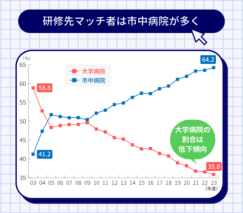特に初期研修におけるマッチングでは給与面において圧倒的に市中病院の方が高く、最近では指導体制も充実している病院も多いため市中病院人気が続いています。