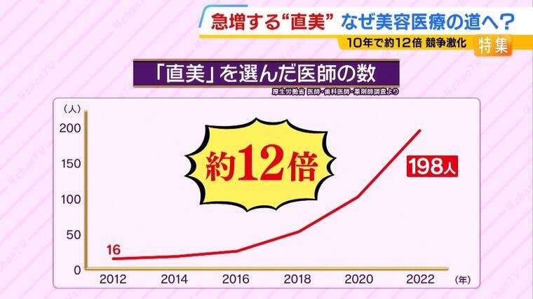 2022年に国が行った調査では、直美の医師は全国で198人に上り、10年で約12倍に増加しました。